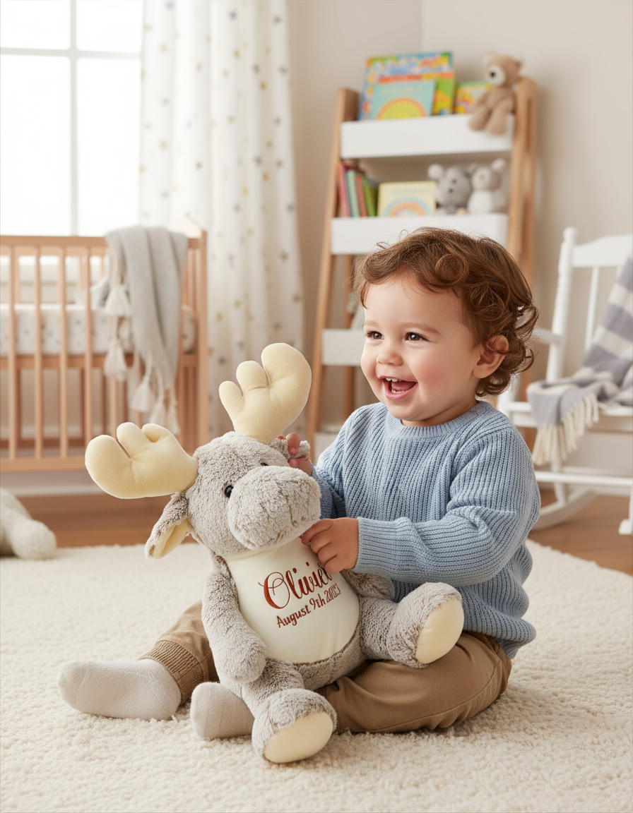 A personalized Moose stuffed animal makes a wonderful newborn gift! Adding a baby's name or birth stats can make it a cherished keepsake for the family.