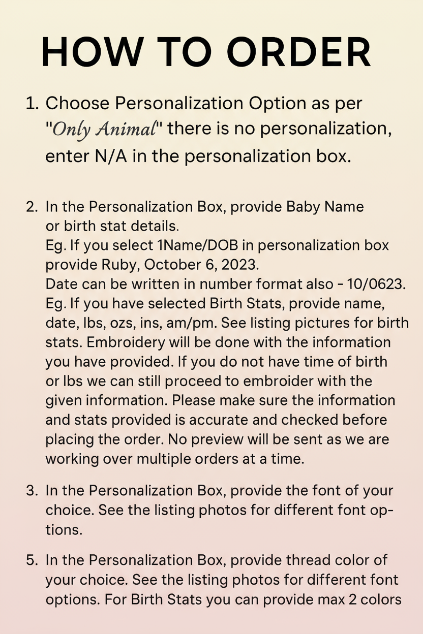 Return Information: Given the custom and personalized nature of our baby products, we cannot accept returns or offer refunds for items that have been personalized accurately according to your order. Please review your order carefully before submission.