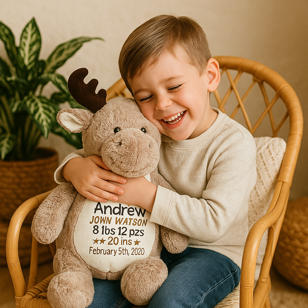 Celebrate the magic of the holidays with our Personalized Christmas Moose Plush, a custom embroidered stuffed animal designed to be the perfect baby keepsake gift or holiday nursery décor. Each moose is embroidered with your child’s name, birth stats, or special message, creating a one-of-a-kind Christmas gift for newborns, babies, or toddlers.