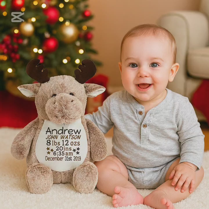 Crafted from ultra-soft plush fabric, this adorable moose is safe, cuddly, and beautifully detailed, making it a favorite for baby showers, first Christmas gifts, and personalized holiday presents.